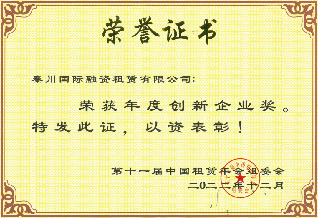 日前,第十一届中国租赁年会评审会对全国三十二家融资租赁行业先进企业予以通报表彰。秦川国际融资租赁有限公司荣获“第十一届中国租赁年会年度创新企业奖”。